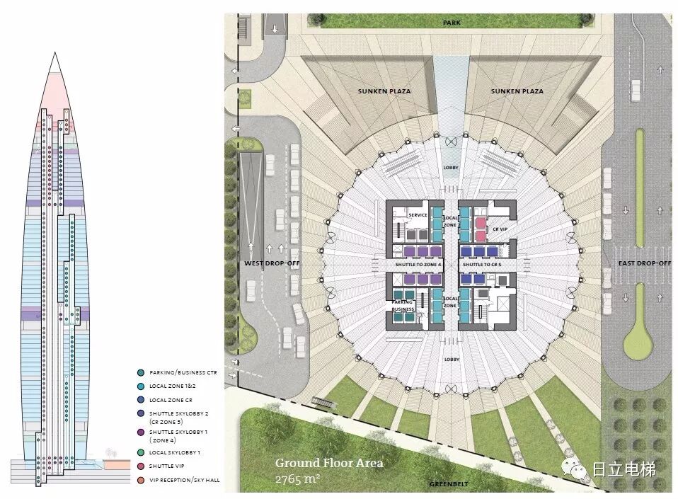 穿梭2区配备的日立9m/s超高速电梯应用可有效控制气流的流线型胶囊构造轿厢,可有效减少由电梯运行速度加快引起的噪音现象,即使乘客在超高速移动中的轿厢内也能有舒适体验。